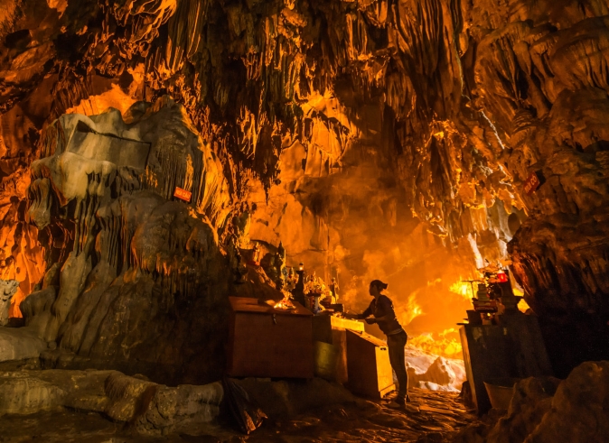 After lunchtime, you will enjoy time to trekking go up and down visit the main cave, step by step you will arrive Huong Tich cave on the top of the mountain (Cable Car for one way or two way available).