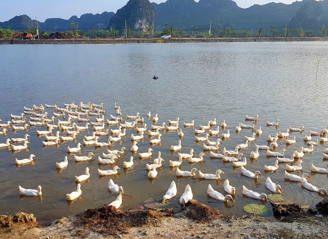 Arrive in Van Long : cycling from Dich Long Bridge and bike on the dyke of Van Long Nature Reserve. You will see caves, green rice fields, limestone peaks and the rural life of the locals.