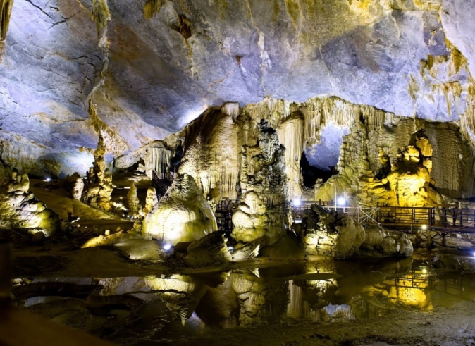 Quý khách có thể chọn tham quan Động Thiên Đường với lỗi dẫn bằng cầu gỗ uốn lượn dài 1km chiêm ngưỡng các khối thạch nhũ tuyệt đẹp được ví là Hoàng Cung Trong Lòng Đất.